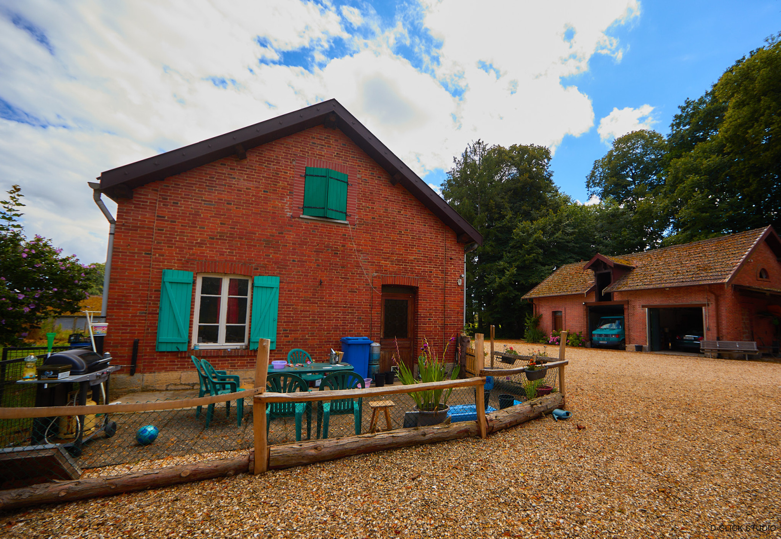 Deux bâtiments en briques : L’un transformé en habitation avec cuisine-séjour, bureau, salon, deux chambres ; l’autre à usage de garage.
